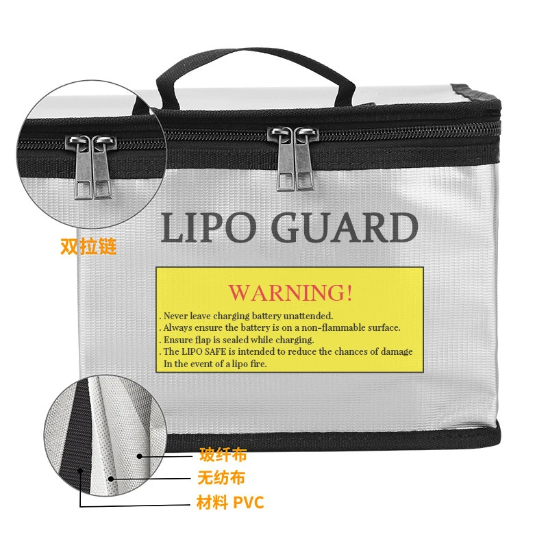 Matériau : Double couche 100 % ignifugée Sac de rangement pour chargeur de batterie LiPo en tissu de fibre de verre avec revêtement en feuille d'aluminium. L'incombustibilité de la feuille d'aluminium renforce la résistance au feu du sac.